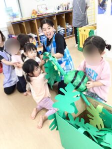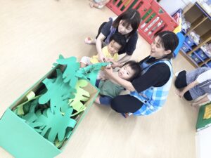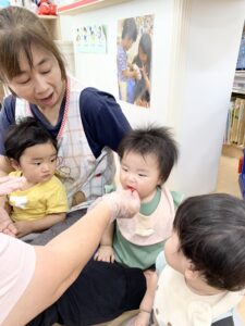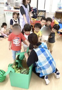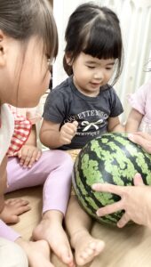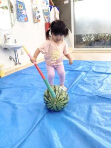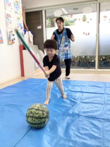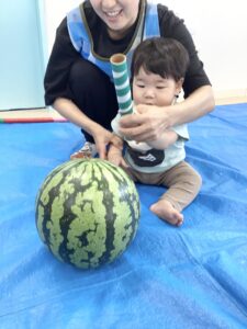 0歳児さんたちもポン!ポン!と良い音を鳴らしながらスイカを叩きます。