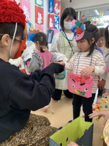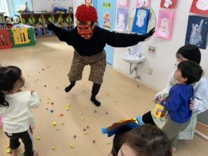 驚いて固まってしまう子や泣いてしまう子もいましたが、「鬼は外!福は内!」と大きな声で鬼に向かって豆まきをする子もいました。