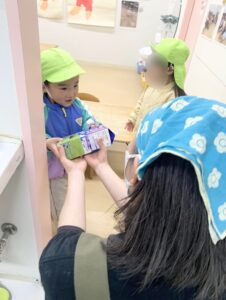 保育園に着くと「買ってきたよー!」と先生に渡しに行きますよ。